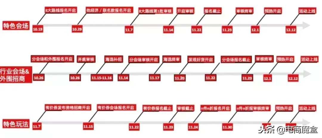 特色会场报名时间为10月19号,截止至11月22号;行业分会场报名时间为10月26日,截止至11月22日;外围是10月26号开始报名,一直可以报名到双12当天。这里《卖家》要提醒一下各位商家,尽量在报名截止前3天完成报名,小二会提前筛选,对于不符合的商品被拒绝,商家还可以有时间换款报名。