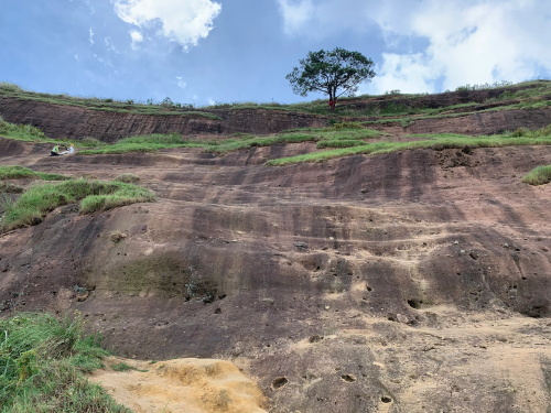 下山就只能原路返回了。整山登山大概要三个小时了,慢一些就更久些!像这种丹霞地貌全国有很多省份均有,事由于地质含有铁矿而呈赤红颜色!南宁较近的花甲山也有不少这种颜色石头,前面也写过一期,不过规模较小,去的人太少,