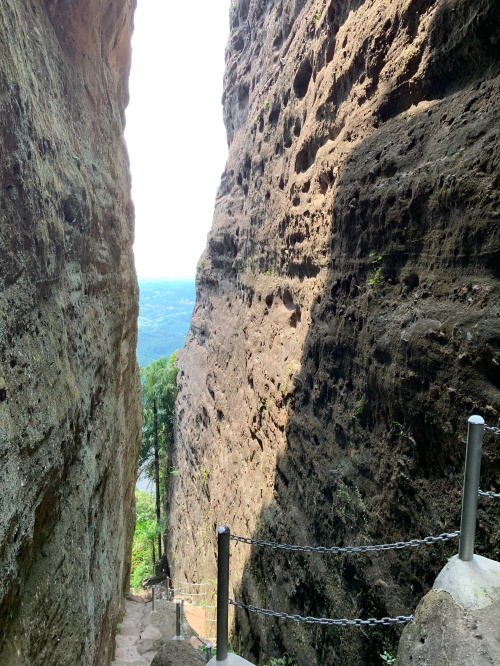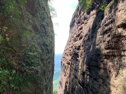 峡谷之间狭窄盘旋,现在已逐渐不少栏杆等防护设施。到了顶处出口,就来到背面了!这是唯一的登山线路。