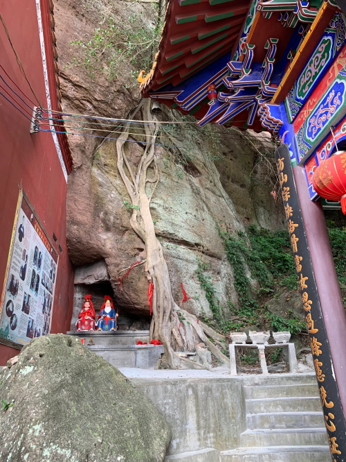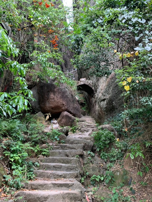 回头那片松林。小庙叫会仙岩,在一处石壁之下,这里已经是最高山头的不远处了。再往上就是最险峻的地方了,倾斜70度以上没有台阶,只有钢钉打在上面,手脚并用攀爬了!