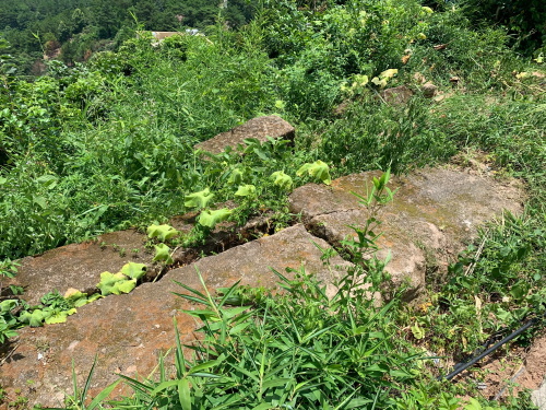 山顶光秃,有不少坟茔!风水宝地了,这是最不好的了!山顶只有杂草,还有一些杜鹃花了!对面山头貌似绝壁无路可走!山顶已风化剥蚀为泥土!四周是光滑绝壁,比较危险!