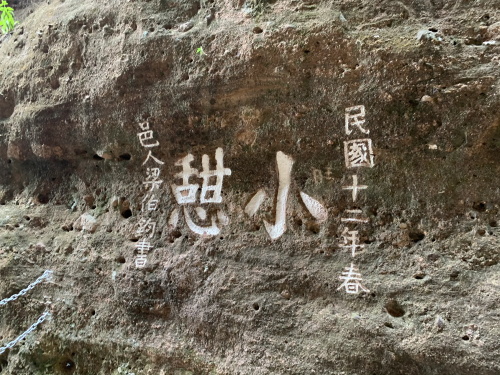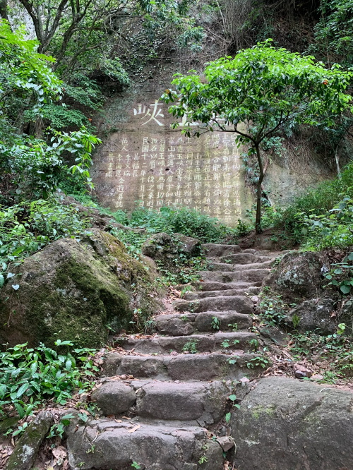 沿途还有不少前人文字标记。这个狭长的峡谷叫苍玉峡,也是一线天,沿着台阶直上旁边均有不少铭牌说明。
