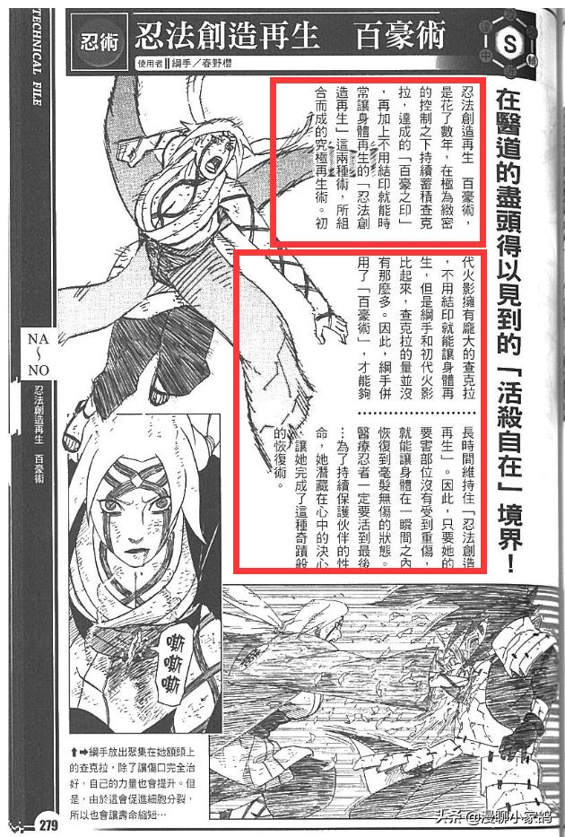 而且,《阵之书》也说了,初代火影千手柱间也使用过百豪术的忍法创造再生,只不过初代把这个术变成被动技能,不能结印就能释放,而且是持续释放状态,但纲手和小樱不行,只能通过结印发动“百豪之印”来施展该术,纲手虽然是初代的孙女,但是查克拉量比起她祖父要少很多,何况是没有血统的春野樱,就更加需要靠结印和查克拉的控制力了。