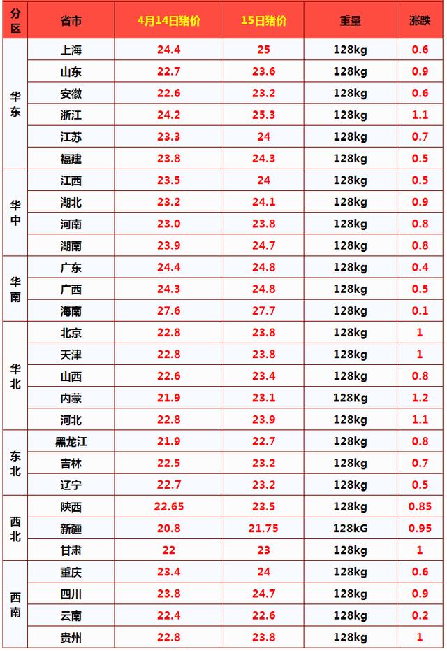 就拿15公斤仔猪来看,截止4月11日,上海报价为1320元/头,北京报价为1275元/头,吉林报价为700-900元/头,四川为900-1275元/头,安徽为1200元/头,山东为900-1200元/头。