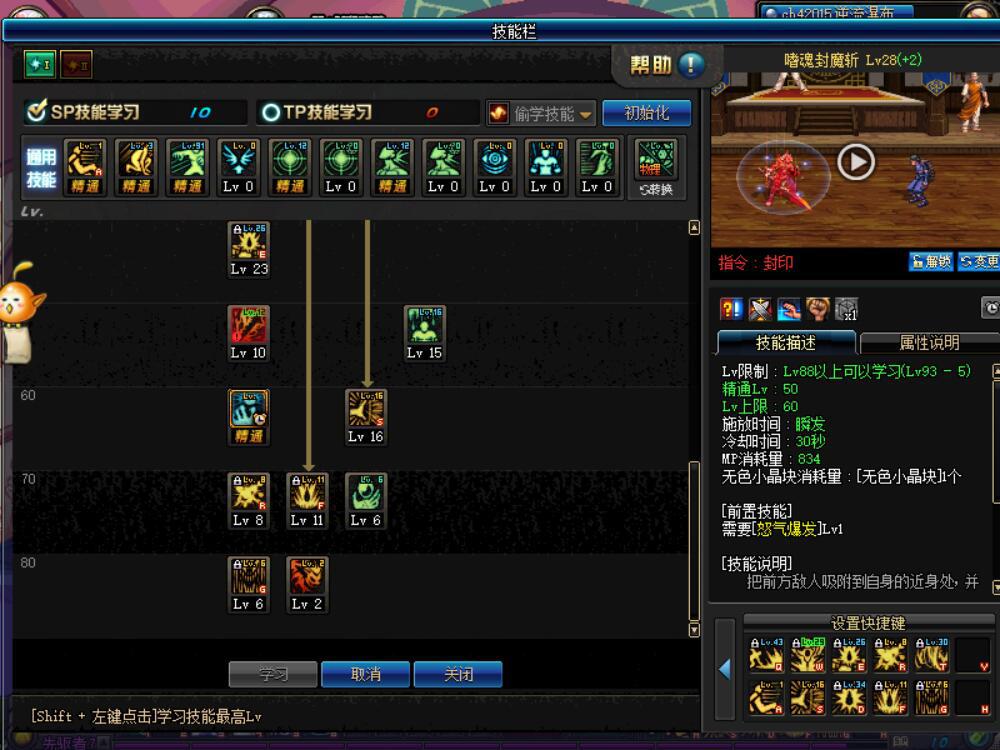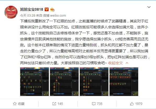 旭旭宝宝说改版后虽然大吸伤害高了,但是比较墨迹,就没有点大吸,而且大抓也没有点,把这些SP用来点其他的技能,而且旭旭宝宝也是把红阵加满了,到BOSS图的时候放一个增加200力量美的很!