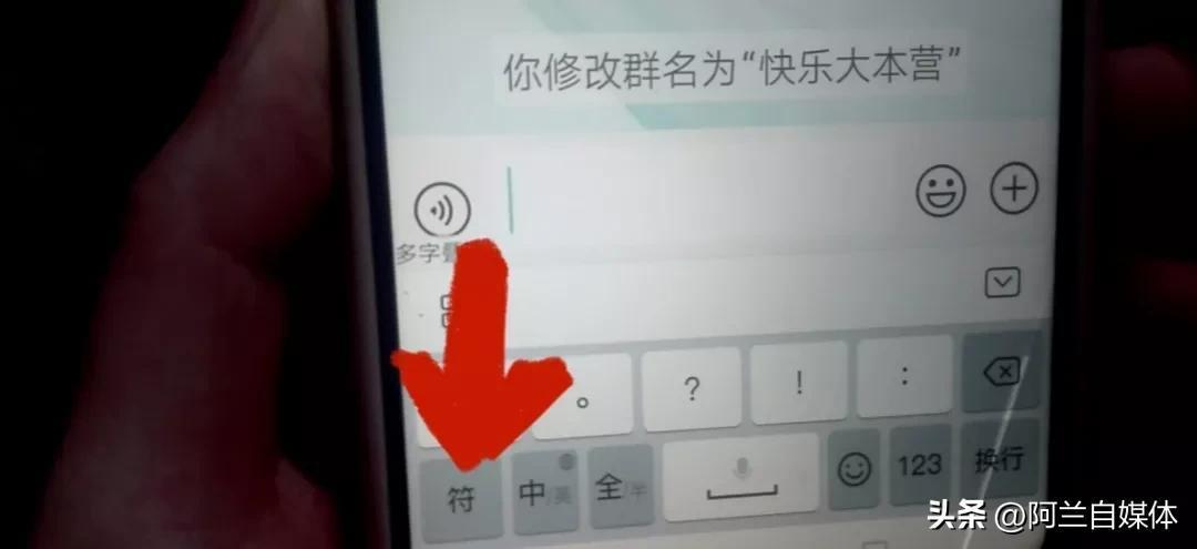 首先我们打开微信,然后打开一个群聊,我们在下方这里有一个输入框,我们把输入框点一下,那么立刻就打开了下方的输入法,在输入法下方我们看到有一个符号的“符”字,我们把这个符号的符字点开!