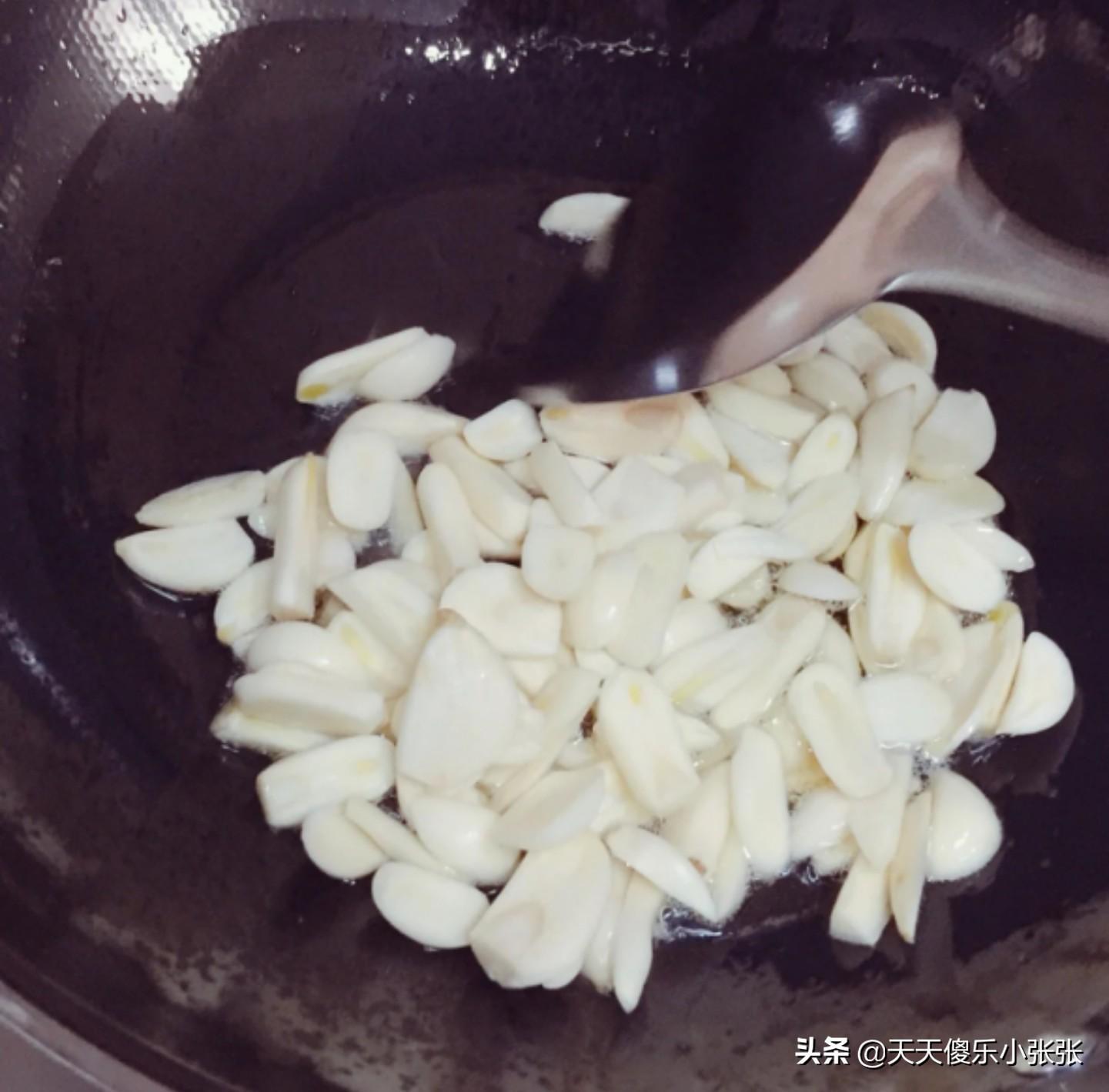3、蒜片和羊肉的比例为1:3。锅中倒油,小火加入蒜片慢慢翻炒至可以闻到香味,颜色变黄。