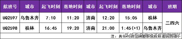 该航线班期为每周二、四、六,去程航班7:10从乌鲁木齐地窝堡国际机场起飞,11:20抵达济南遥墙国际机场;12:20从济南遥墙国际机场起飞,15:05抵达桂林两江国际机场。返程航班16:45从桂林两江国际机场起飞,19:20抵达济南遥墙国际机场;21:00从济南遥墙国际机场起飞,次日1:45抵达乌鲁木齐地窝堡国际机场。