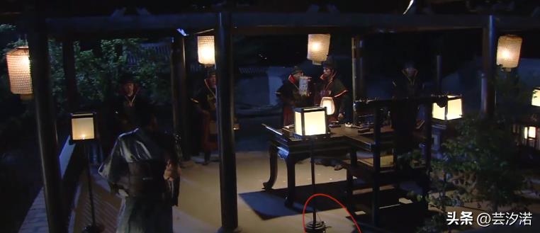 不仅如此,在接下来这个镜头中,狄仁杰大晚上在庭院内办案,我原本以为这些灯笼里的灯是蜡烛,但结果地下的电线却穿帮了,古代出现电灯这简直也太超前了吧。