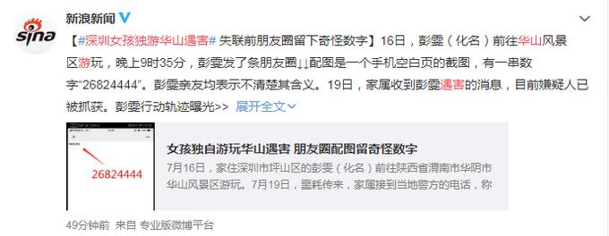 7月16日,家住深圳市坪山区的彭雯(化名)前往陕西省渭南市华阴市华山风景区游玩。7月19日,噩耗传来,家属接到当地警方的电话,称彭雯已经遇害,犯罪嫌疑人被抓获。