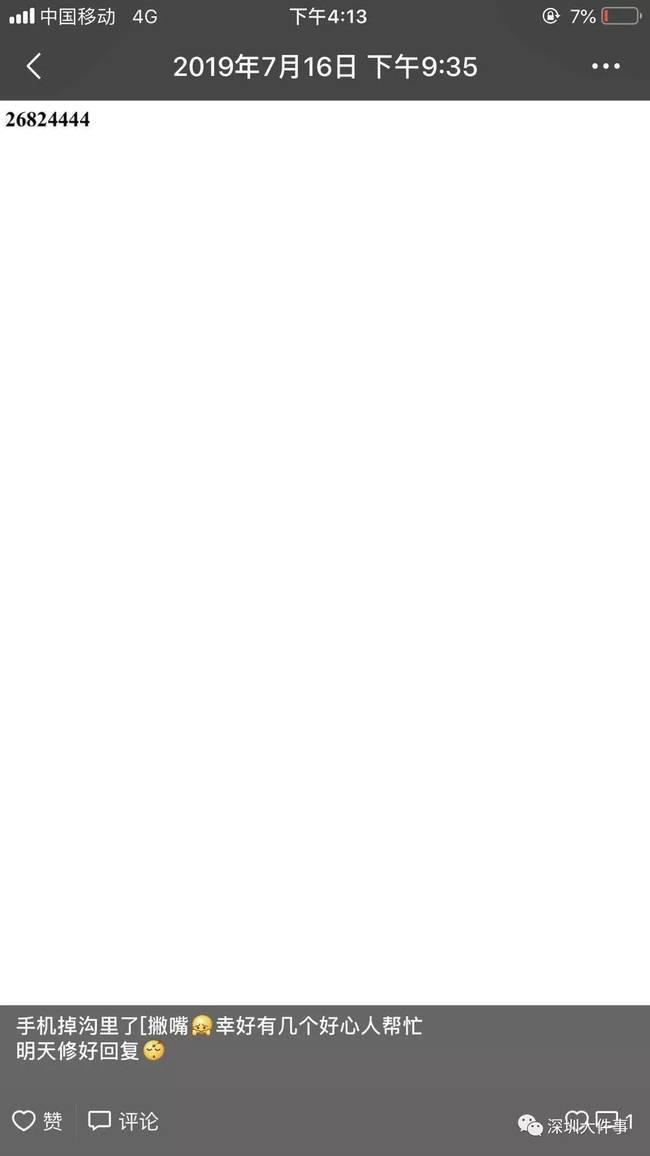 在此条朋友圈中,女友称,“手机掉沟里了,幸好有几个好心人帮忙。明天修复”。南都记者注意到,朋友圈的配图中有一串数字“26824444”。