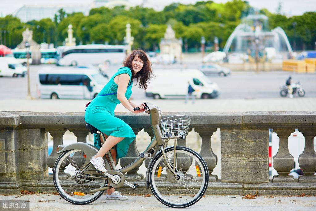 美丽的年轻女子在巴黎的一条街道上骑一辆自行车