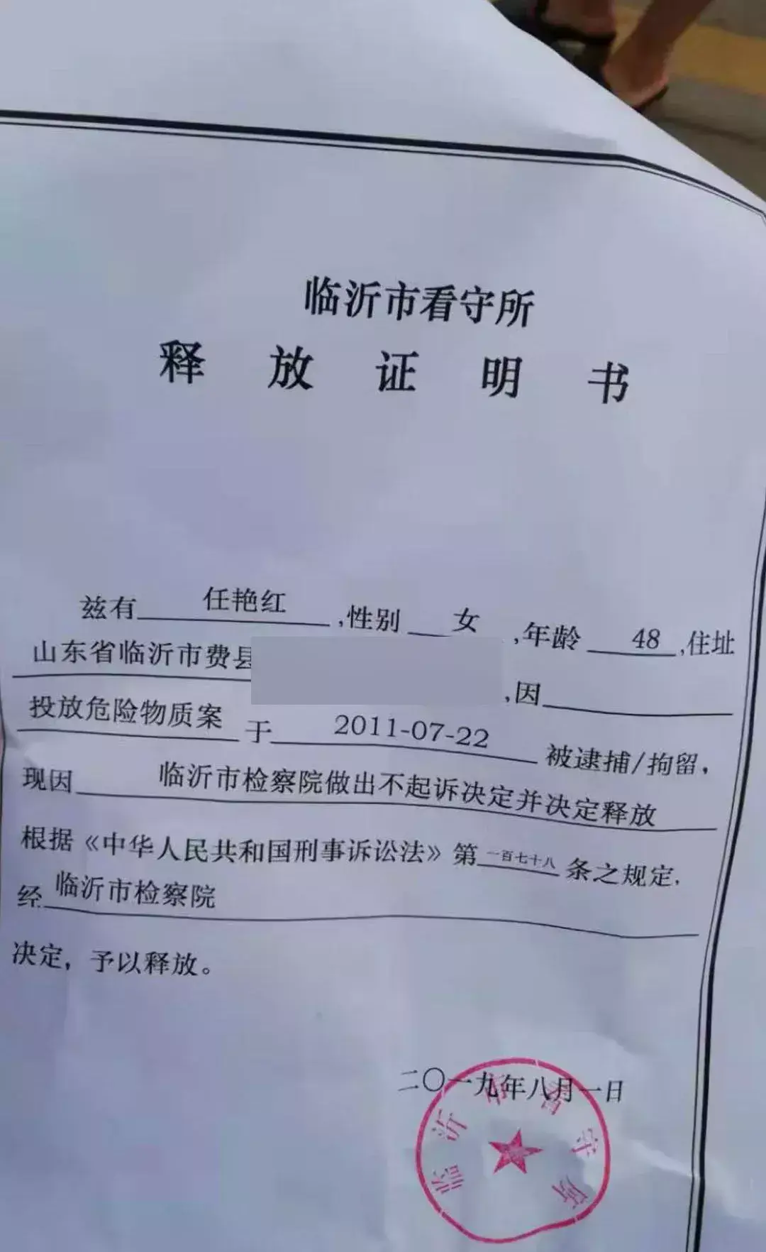 8月1日下午,因涉嫌投放危险物质罪被拘留被逮捕,在看守所呆了8年,两次被法院判处死刑缓期执行的山东农妇任艳红获得释放证明,走出了看守所。