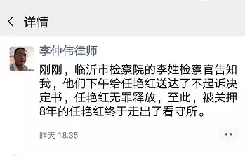 一个月前,临沂市检察院撤回了对任艳红的起诉。任艳红表示,下午接到了释放证明书,出来后她与家人抱头痛哭。
