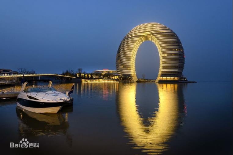 8、浙江湖州喜来登温泉度假酒店:它又叫作“月亮酒店”,位于湖州市南太湖旅游度假区核心板块,它是一座高达100米,宽116米指环型建筑,总建筑面积有75000平方米之大,共有300多间客房,“月亮酒店”是中国第一家指环型水上建筑,是中国第一家化生态观光、休闲度假、高端会议、美食文化、经典购物、动感娱乐体验为一体的水上白金七星级度假酒店。