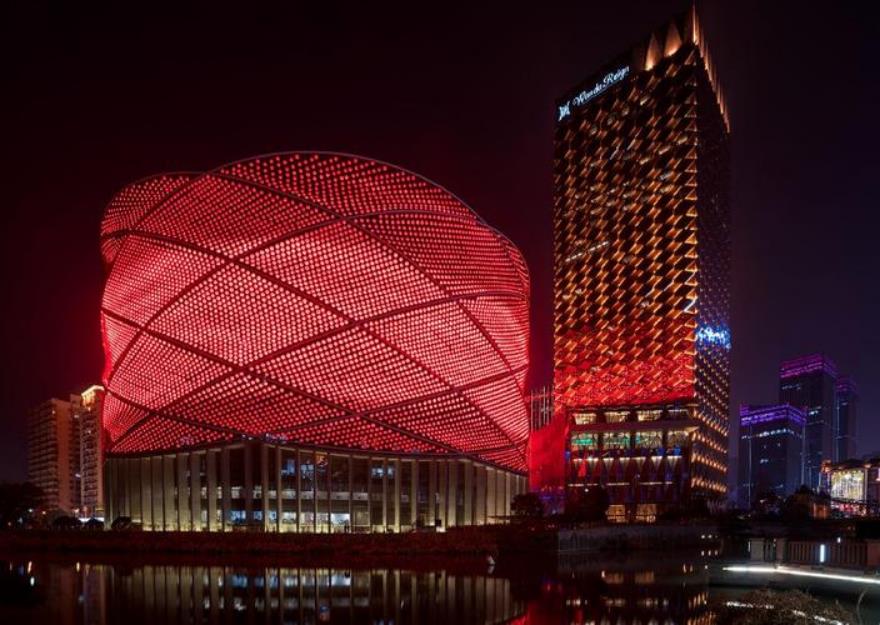 7、汉秀剧场:它位于武汉市武昌区水果湖畔,整个外表看起来就像是一盏灯笼一样。它是世界上第一座可以移动、升降座椅的水秀剧场。它不仅外表独特引人,在里面每天都还有好看的表演可以观看。