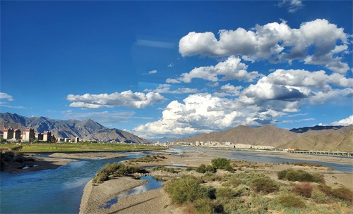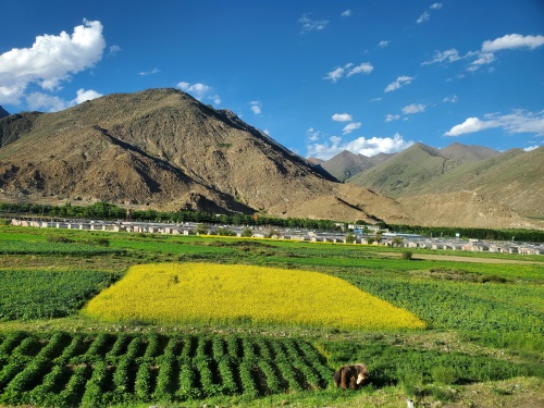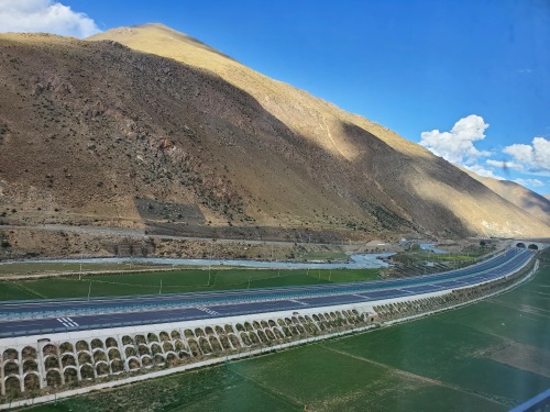 继续向西南行进,经过当雄后,铁路两边逐渐有了一些低矮的树木,河谷地带开始有了一些农作物。从那曲开始,伴随青藏铁路的不仅有了109国道,而且还有了高速公路,西藏的高速公路是全年免费通行的。