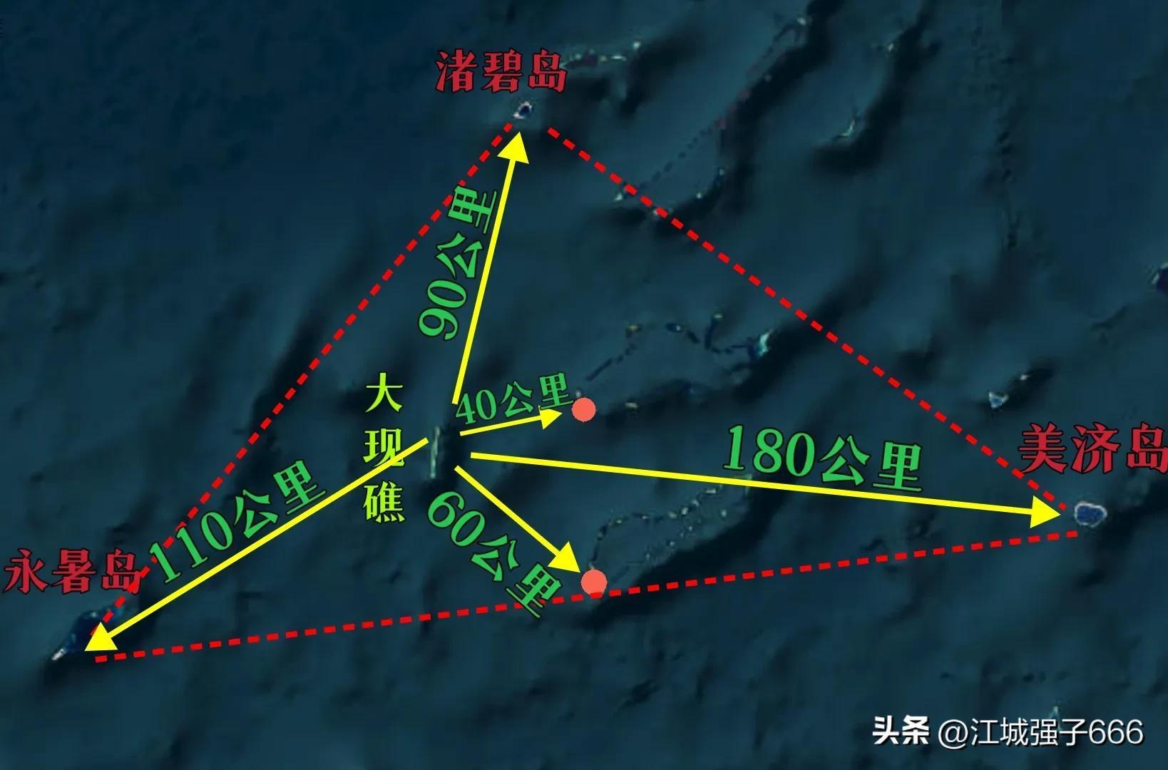 大现礁地处南沙小三角核心位置,该礁距离渚碧岛90公里,距离郑和群礁的南薰岛只有40公里,距离九章群礁的赤瓜岛60公里,距离南沙小三角之一的永暑岛110公里,距离美济岛180公里,从这些数据看,大现礁地理位置相当优越,只是大现礁目前不在我方手中控制,着实可惜。