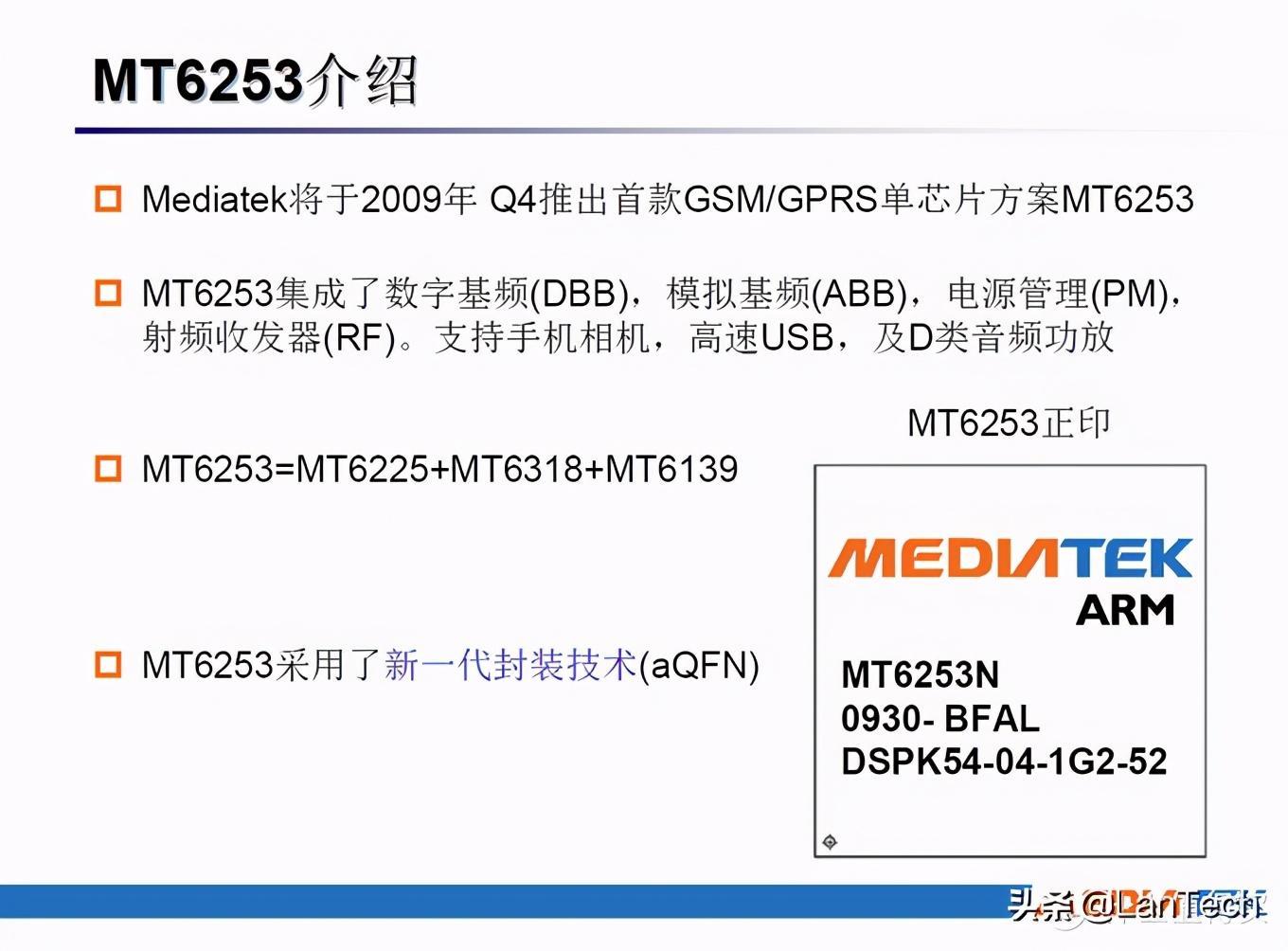 这台手机采用的是联发科的MT6253方案。MTK的方案集成度较高,而这片MT6253更是把基带、射频和电源管理都集成到了一起。所谓射频部分,是指负责信息发送和接收的部分。而基带部分,简单来讲就是信息处理的部分。电源管理,顾名思义就是负责整机的各个部件的供电管理和电池充电的芯片。这张PPT说得非常到位: