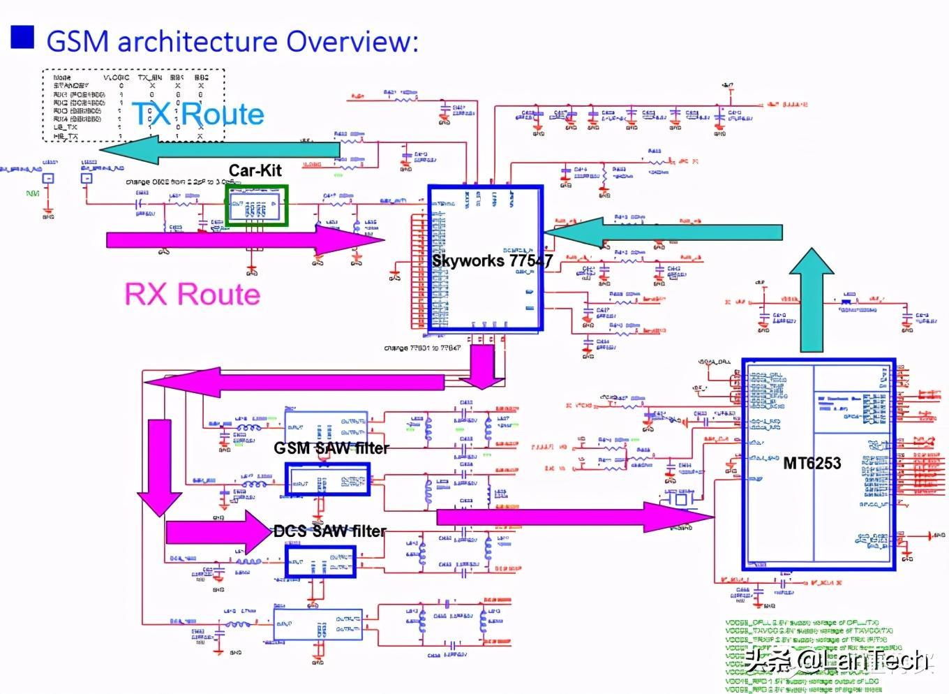 GSM通信部分的电路图,我特别标注了一下,收(RX)发(TX)路径其实非常清晰,信号通过SKY77547这颗PA进行放大,接收时先放大再通过声表滤波器: