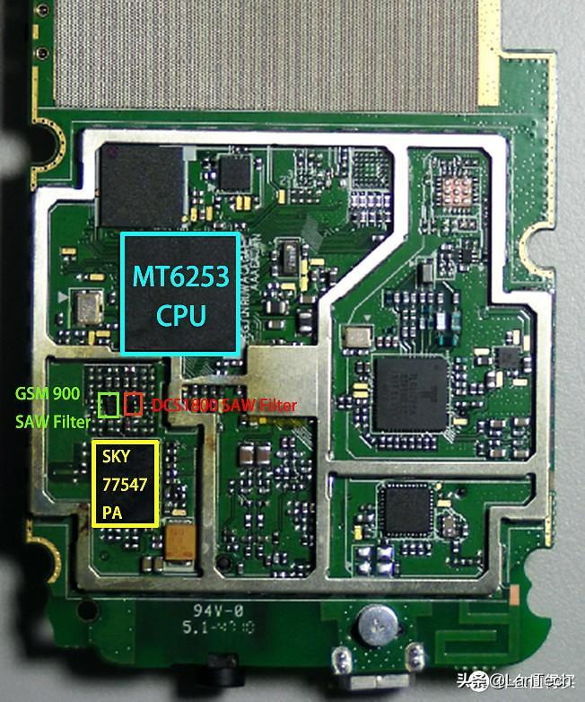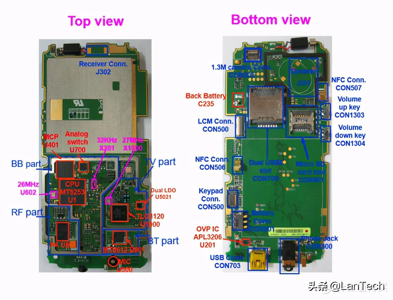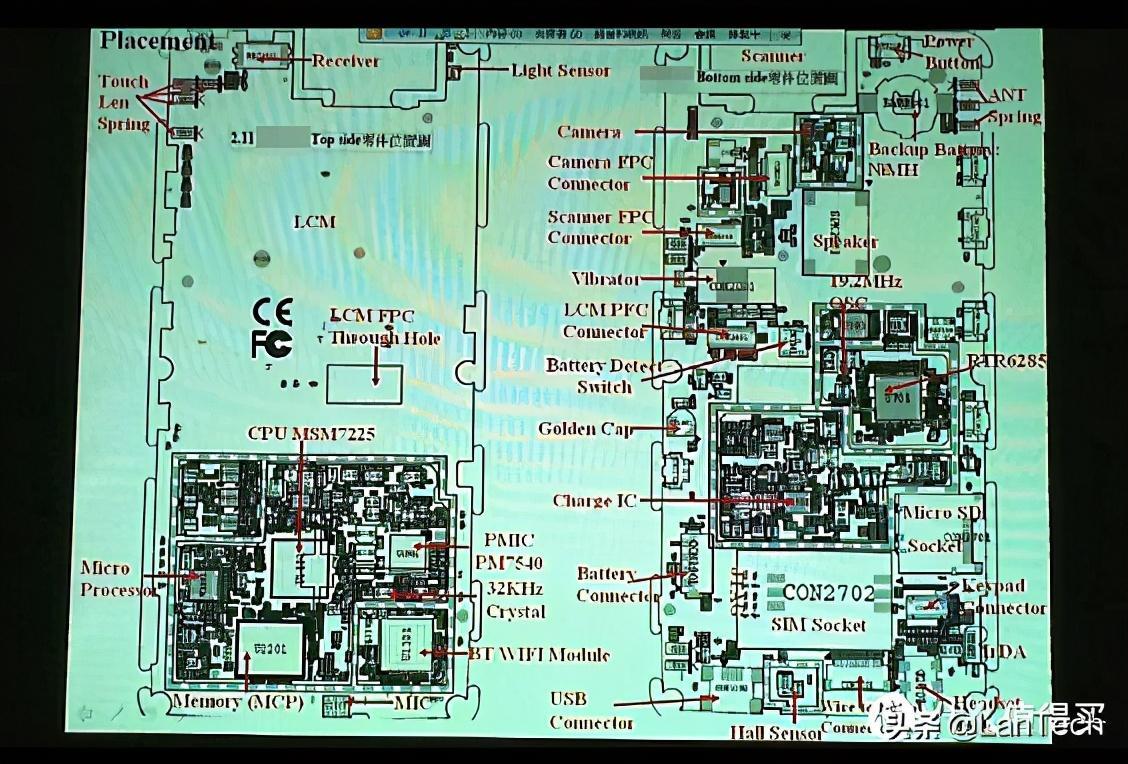来看看这款手机的电路板的正面和背面的Placement。基带(BB)、射频(RF)、蓝牙(BT)、电视(TV)等模块都分别做了标注。Block Diagram上标注的主要元件在PCBA上都比较容易找到: