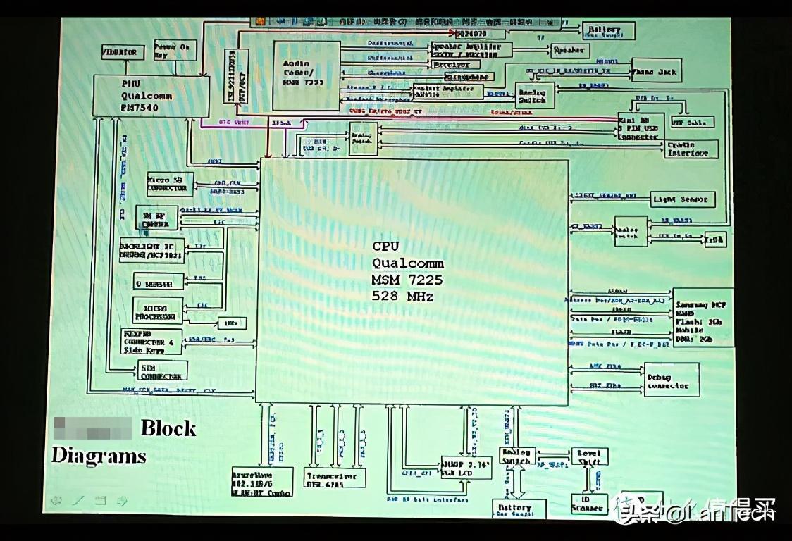 限于NDA保密协议,只能用几年前的古早机型了,但是其实整体的概念是相通的。可能有人会说MT6253严格意义上来说并不是真正的智能手机解决方案,那么再举一个高通方案的例子吧,其实整体的组成是比较类似的。这里以一款基于高通MSM7225方案的产品为例,这个可以算是真正的智能平台方案了,同样是比较早期的产品。(关于MSM7225,大家可能没什么概念,这里举个例子,火腿肠的G8野火采用的就是MSM7225,当然这台机器并不是G8 Wildfire)。可以发现,高通并没有把PM IC也一并集成到CPU里,而是采用了一颗独立的PM7540,集成度相对来说没有MTK那么丧心病狂: