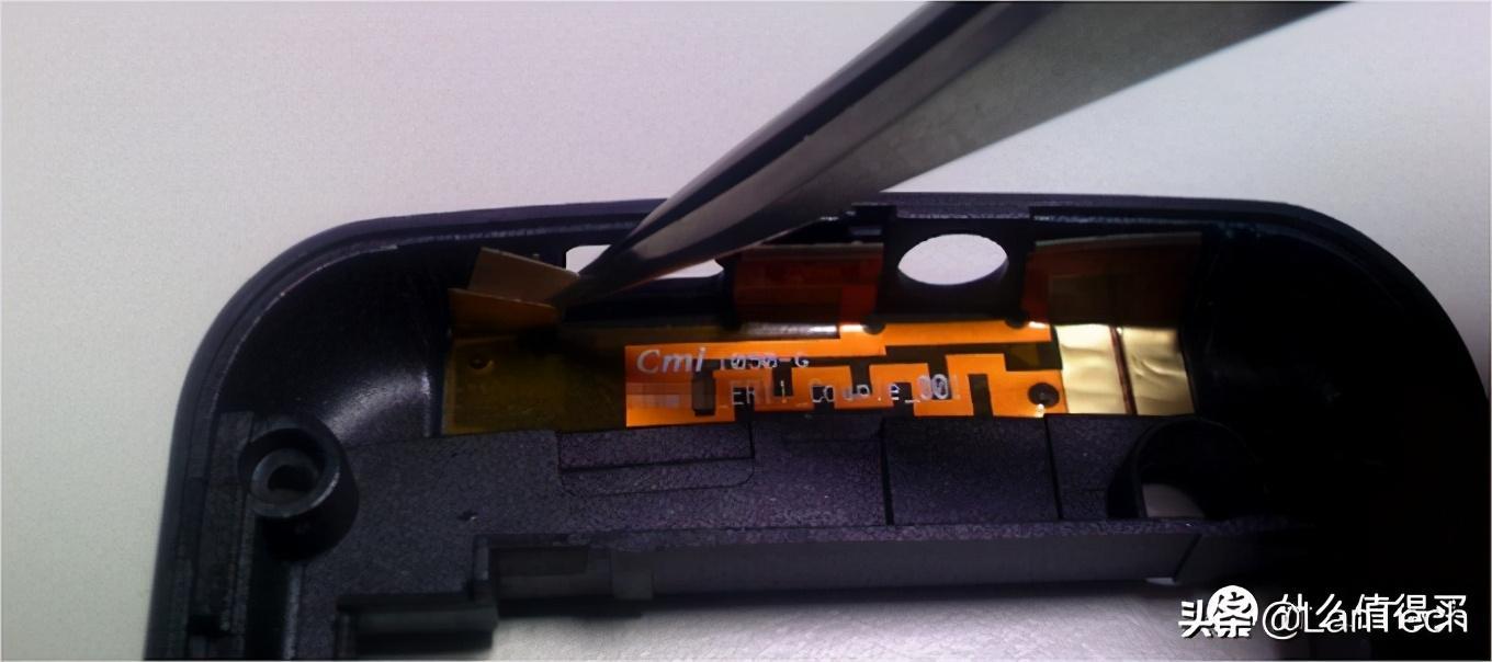 以上内容可能太过专业了,不做深入展开了。来看看实体的内置GSM天线吧,位于机壳底部。注意看右侧的两个金属触点,是用来与主板相连的。这种FPC天线算是老古董了,现在很少见到: