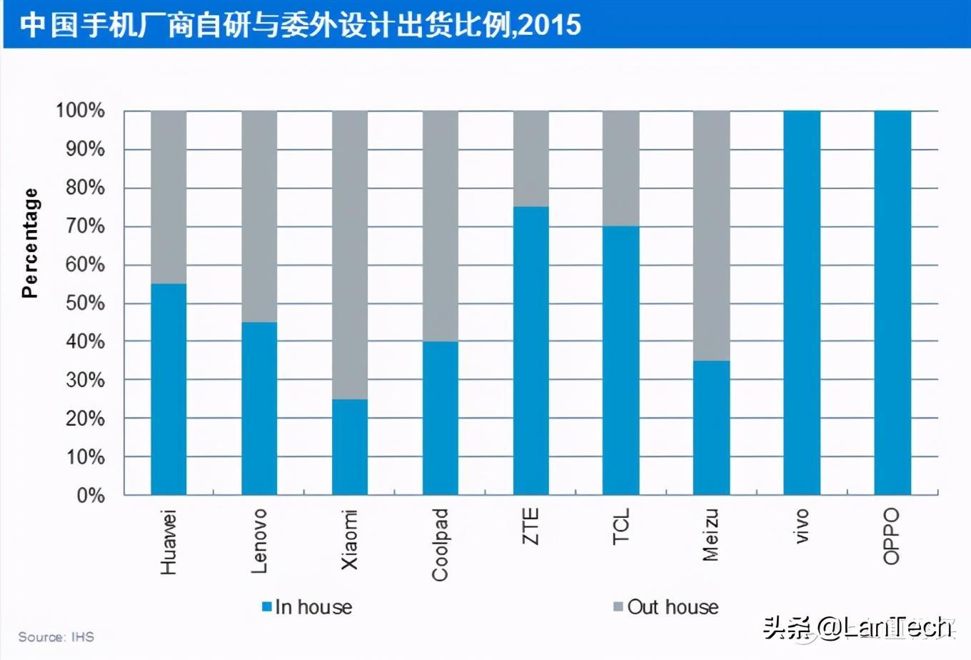 典型的代表是国内的蓝厂(vivo)和绿厂(OPPO),研发和生产都布局在广东。包括早期的诺基亚,也是这种模式。来看看国内品牌厂商的自研机型出货比例: