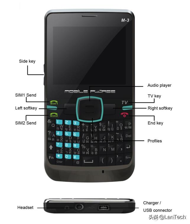正面和底面的渲染图,标明了主要按键和接口。双卡双待,还支持电视功能: