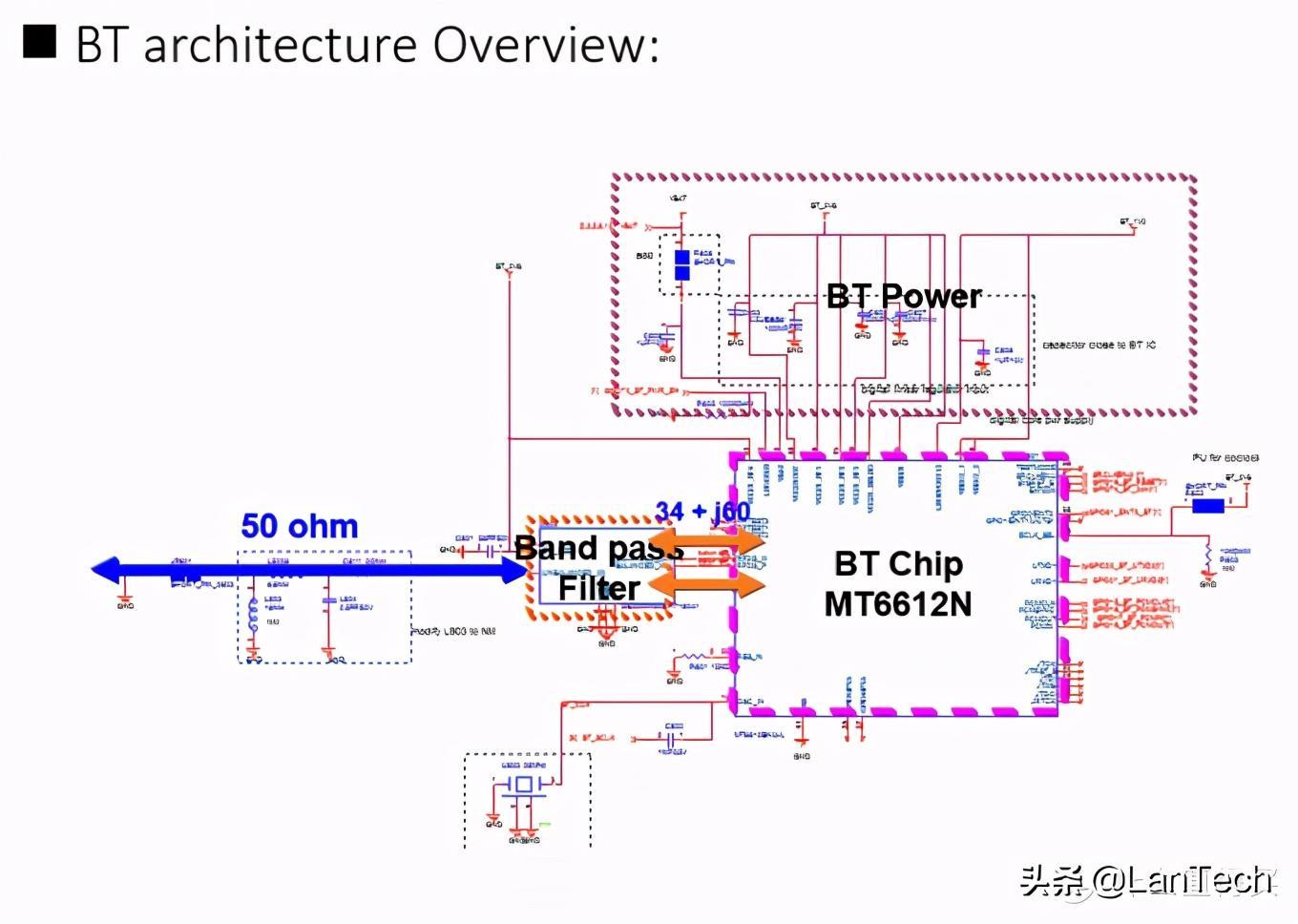 蓝牙部分的电路图,上方虚线框中是供电部分的电路(BT Power),左侧是带通滤波器(Band-pass Filter),标准的50欧姆阻抗匹配: