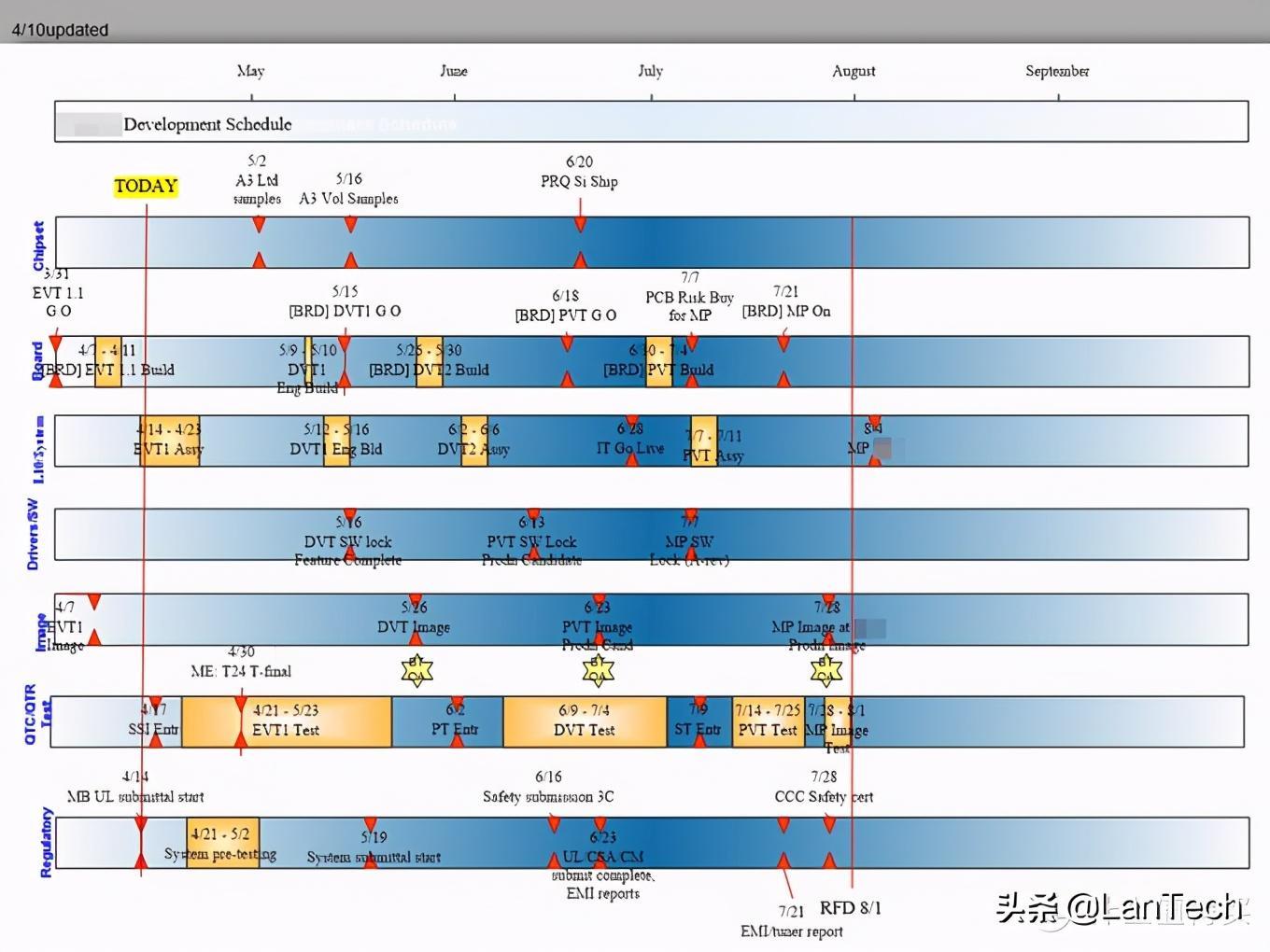 整个Project从立项(Kick-Off),到真正大规模量产(Mass-Production)上市,当中也要经过EVT(Engineering Verification Test,即工程验证测试)、DVT(Design Verification Test,即设计验证测试)和PVT(Pilot-Run Verification Test,即小批量试产验证测试)这三个阶段。而DVT和PVT阶段生产的机型,就是我们通常所说的工程机。整个过程是由产品经理(PM)协调研发工程师(R&D)共同完成的。整个流程与笔记本电脑的研发较为类似。下图就是产品经理手上的研发周期控制表,可以看到软硬件是同步开发的: