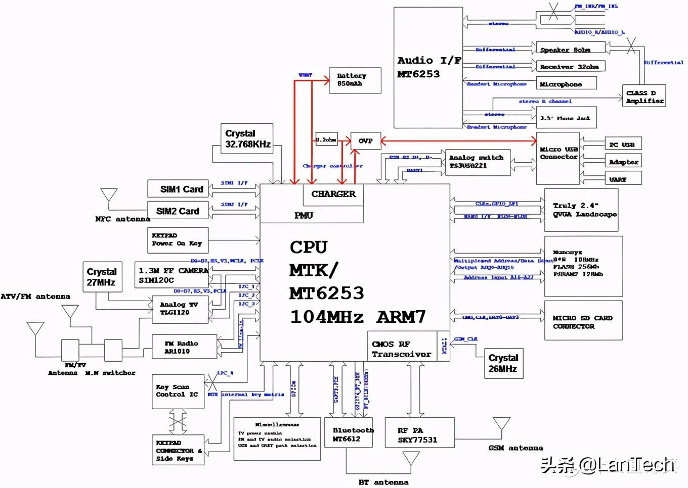 采用MT6253方案的整体框图(Block Diagram),这张图看起来就十分清楚了。MT6253中集成了射频收发器,可以通过射频功放进行信号收发。同时,也集成了PM IC,负责供电以及电池的充电。Baseband部分的连接和总线也都做了清晰的标注: