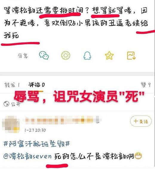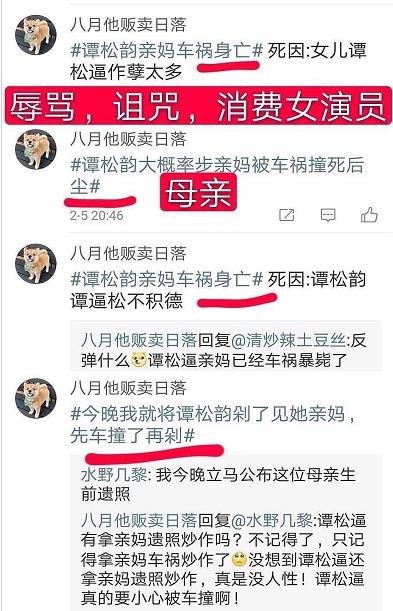正常人都会对谭松韵的遭遇抱以同情,但这些粉丝却在网上说:谭松韵的母亲之所以去世是女儿造孽太多,死的怎么不是她呢,还说要公布谭松韵母亲的遗照,这些话语简直太过恶劣了。