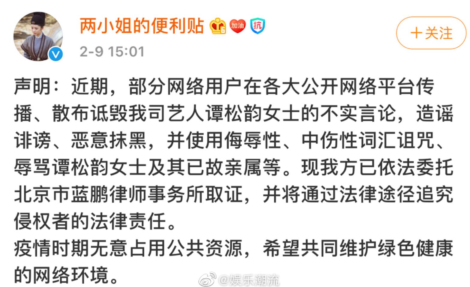 但如果网络暴力上升到了家人身上,这件事就忍无可忍了。最近谭松韵工作室发了一则法律文件,说针对近期网上对谭松韵的不实言论,对已故母亲的诅咒和侮辱,采取法律途径追究责任。