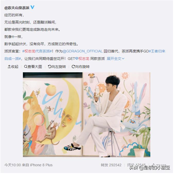 此次微博首次露面,主要是官宣他成为农夫山泉“茶π”的代言人,农夫山泉官微也在第一时间认领了自家的代言人。代言图中,权志龙身穿白色西装,脚穿一双带有他标志性“小雏菊”的鞋子,看起来十分纯洁美好。这也是既2015年,农夫山泉茶π和bigbang(权志龙所在男团)合作之后,权志龙以单人的身份再次和该品牌进行合作。