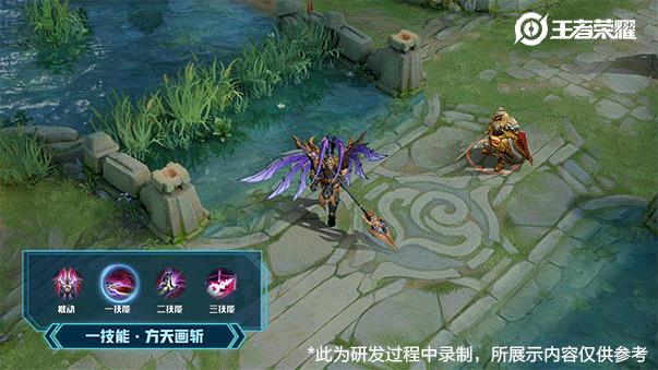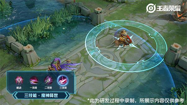 一技能强化了方天画戟重击端的纹路特效,有由轻到重再到轻的过渡,很好的体现出了魔神邪魂缠绕的主体元素,另外方天画戟所过之处还细心地加入了符文法阵,附魔效果也升级成为了小恶魔特效。
