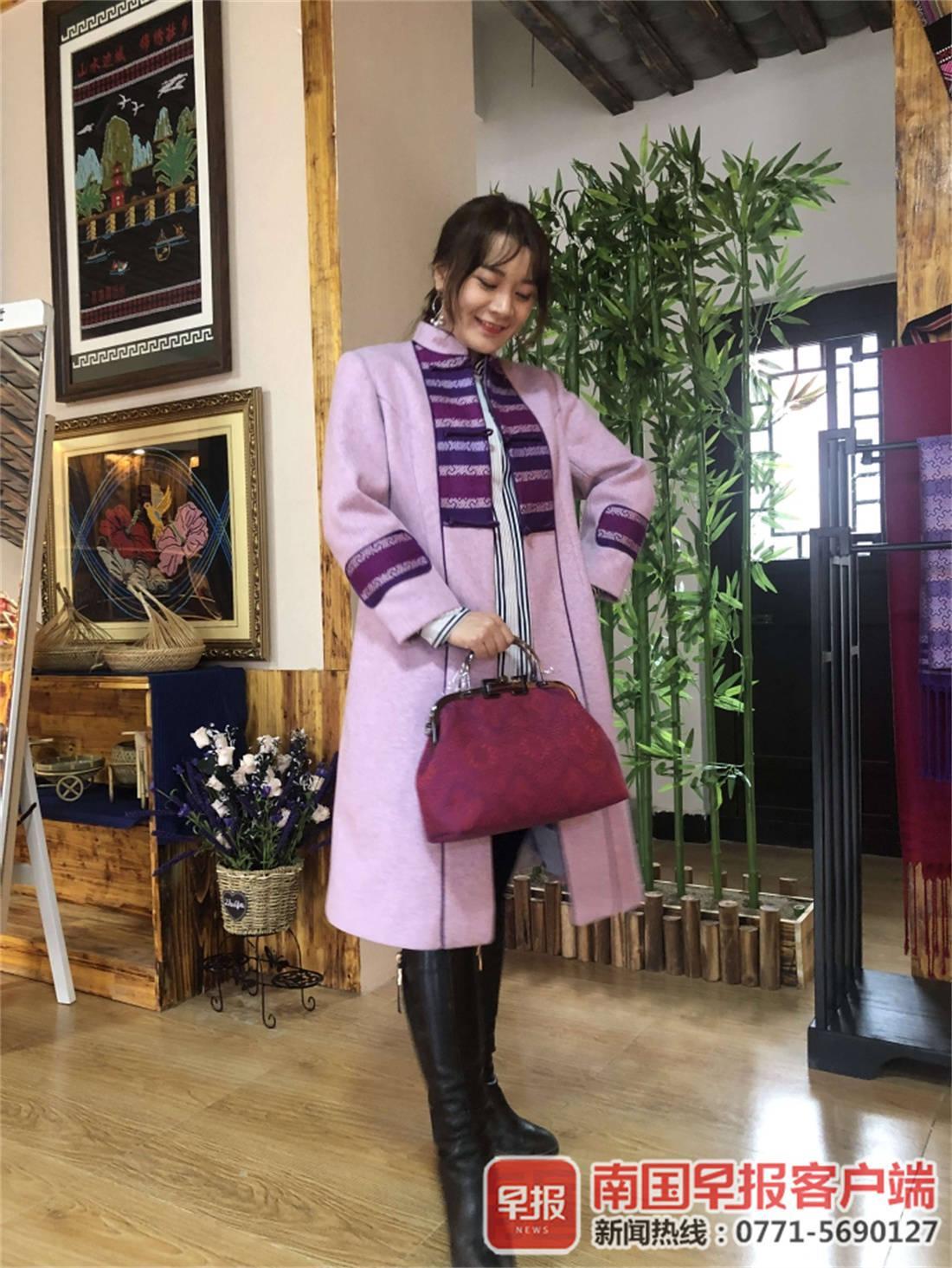 这些新式的壮族服装,除了款式更符合现代人审美,纹样也经过重新描摹设计,配色变得清新淡雅,有民族特色,又可日常穿戴。除了新式的壮族服装,还有新配色的壮锦围巾、披肩,首饰和包包等服装配饰。这些产品所用到的壮锦大多数由织娘手工织造而成,有着不同于机器流水线的精致。