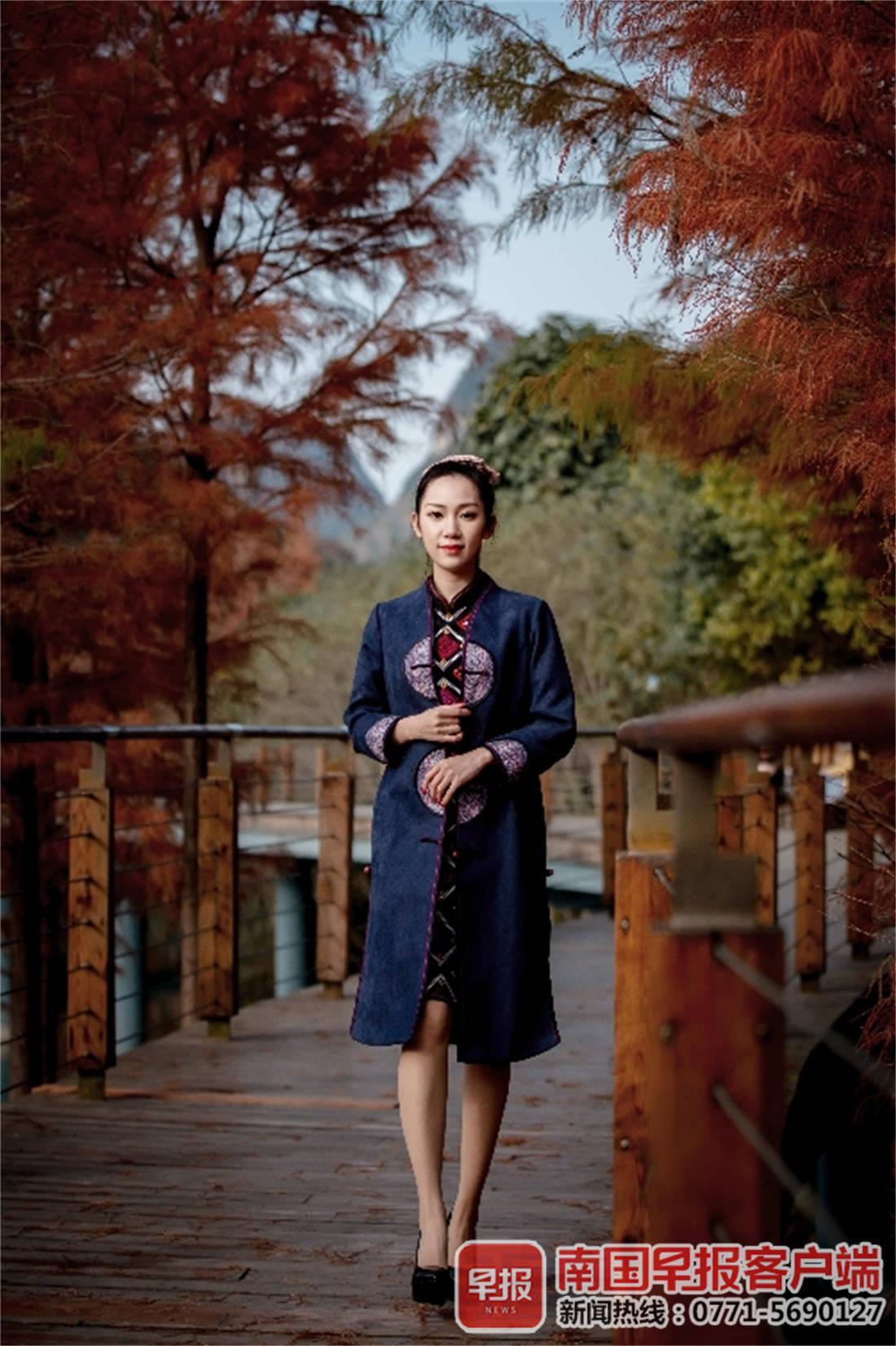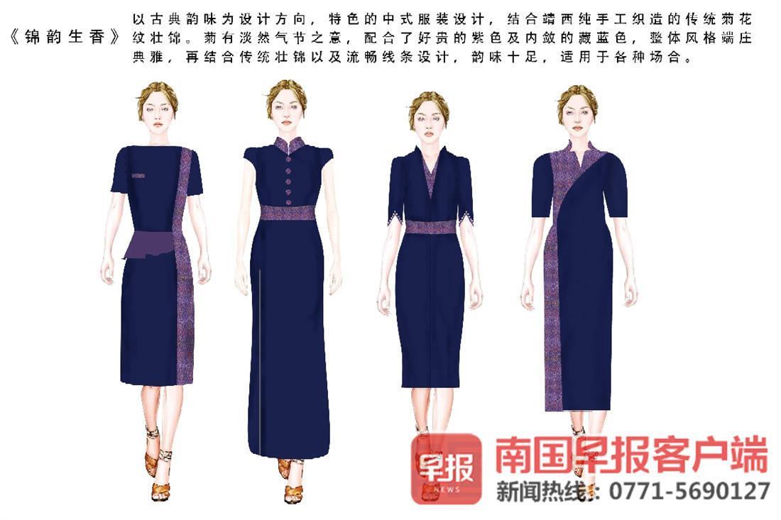 在去年的一个广西民族服饰设计征集与展演活动中,李村灵参与设计的、带有浓郁壮族风情的《锦韵生香》顺利进入复评阶段。这一系列服装,以特色的中式服装设计,结合壮锦的传统菊花纹,以紫色和藏蓝色为主色调,整体风格端庄典雅,韵味十足,适用于各种场合。