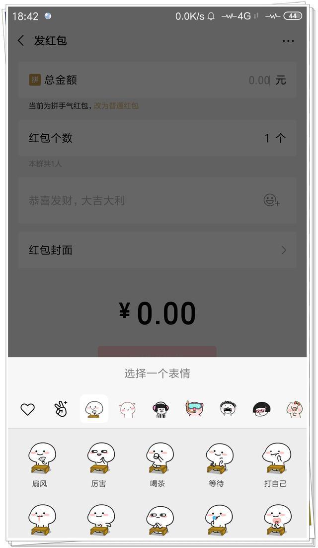 那么大家肯定很好奇这种带有gif图的表情包是怎么制作的呢?其实也很简单哦!在大家往群里发红包的过程种,输入金额以及红包个数,再点击右边的【表情】,把gif表情图添加进来,然后发送就可以了。