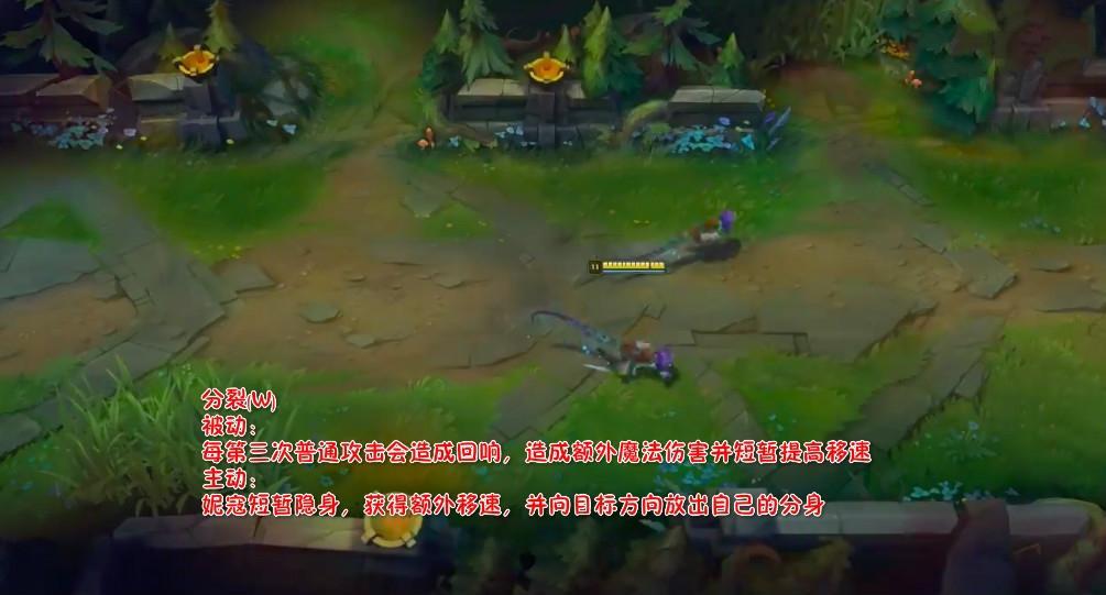 W技能如果光看技能介绍的话有点难以理解,不过其实是非常简单的。妮蔻的W技能分为主动释放和被动释放两种状态,被动可以增强妮蔻的线上对拼能力,这个英雄和你线上对A,是完全不虚你的,被动技能类似于VN的W技能,如果W技能主动释放的话,就会释放一个影分身,类似于妖姬的被动技能。