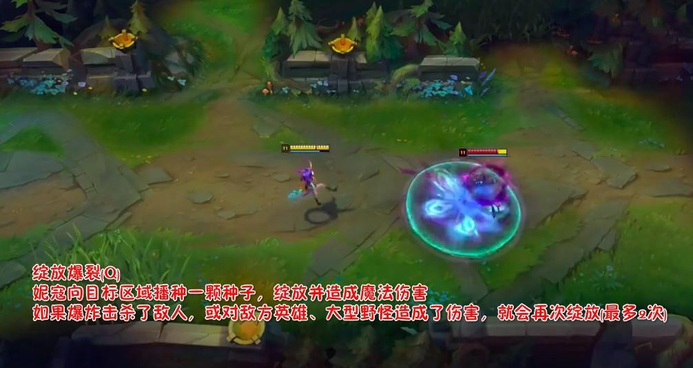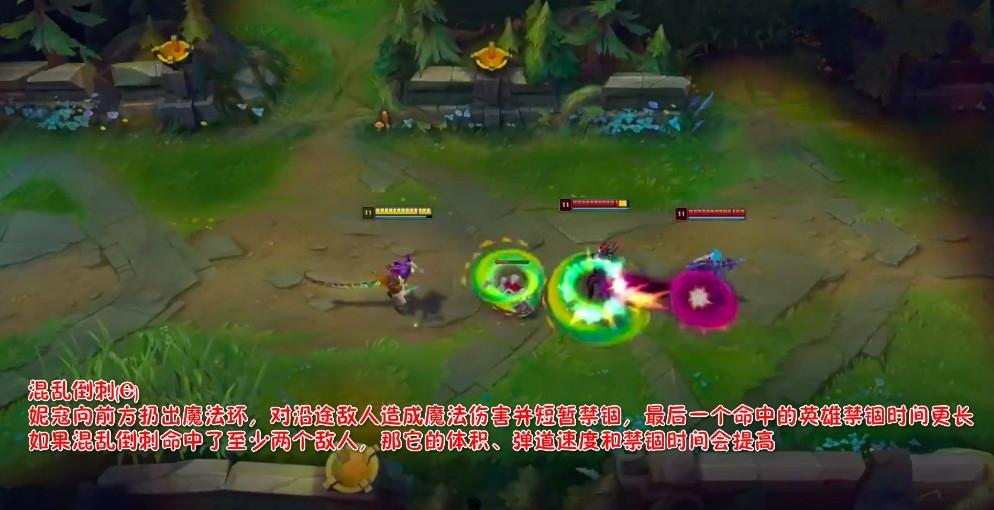 对于一个强力的法师来说,制造AOE的能力是非常重要的,妮蔻的E技能就是为了提高她的AOE能力。而且妮蔻的E技能不仅可以提供AOE伤害,还可以禁锢敌人。有点像老版瑞兹E技能的弹射加W技能的效果。这个技能就决定了妮蔻是一个上限非常高的英雄了。
