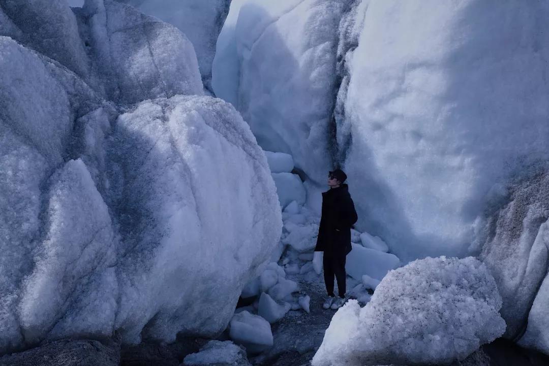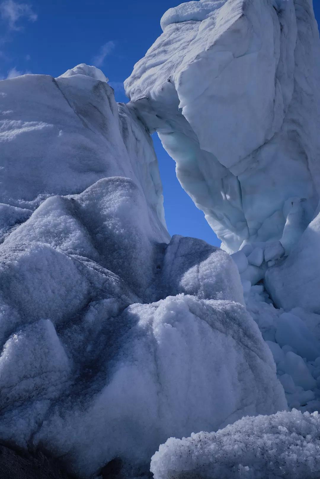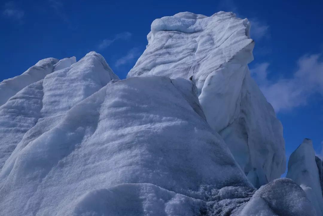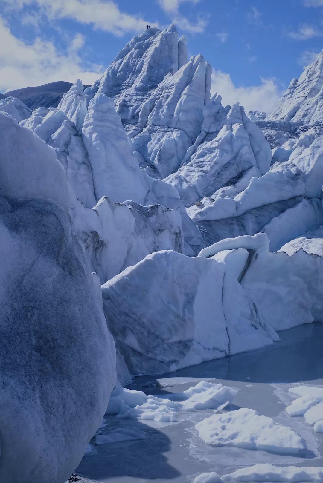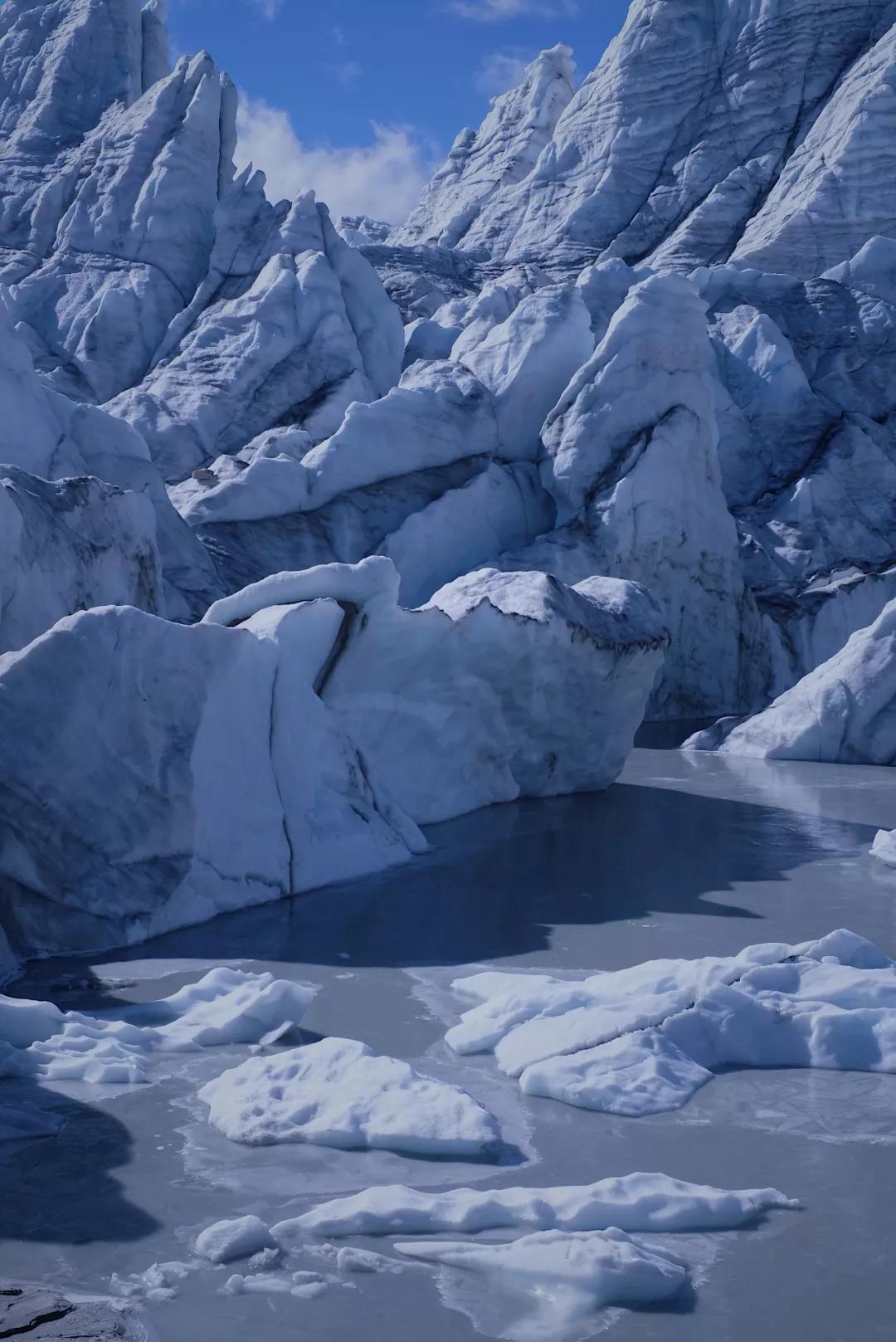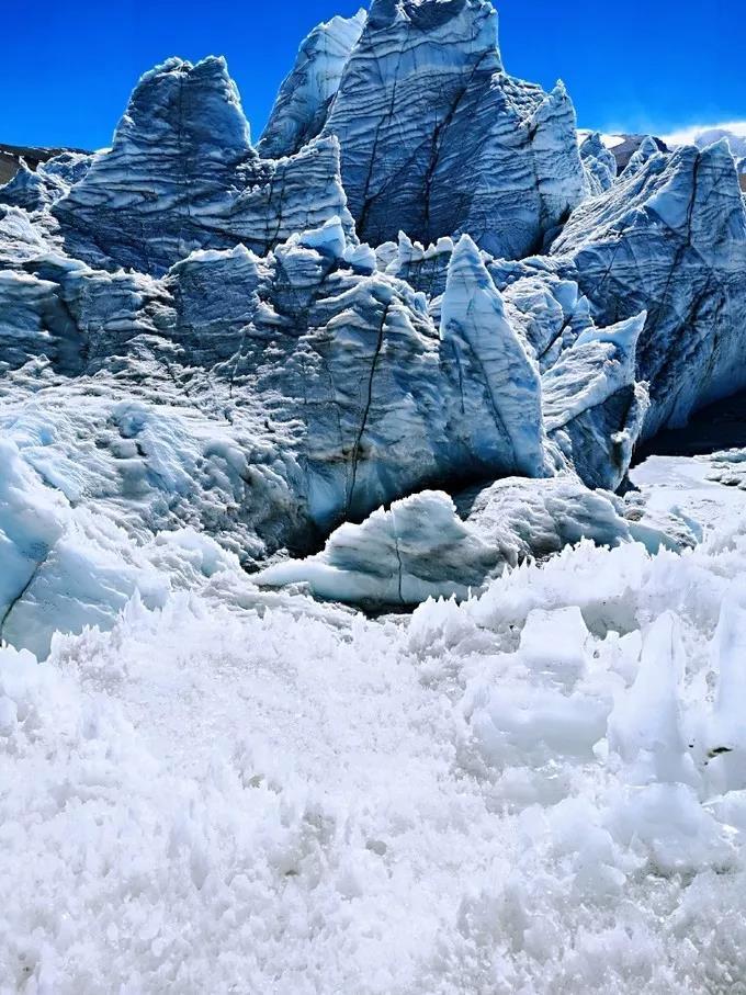 天空湛蓝清澈得像天堂,仿佛触手可及。脚下的湖面倒映着连绵的冰川,冰面流淌着不同深浅的蓝。裂缝中冰棱的纹路好看极了,站在河岸的山体上,天地辽阔、静谧无声。