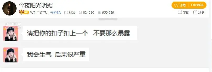 昨日,宇文泡在直播间期间衣服穿的比较漏,衬衫解开了两个扣子,担心宇文泡勾引到其他小姑娘,zero发微信吃醋要求宇文泡把扣子扣起来。