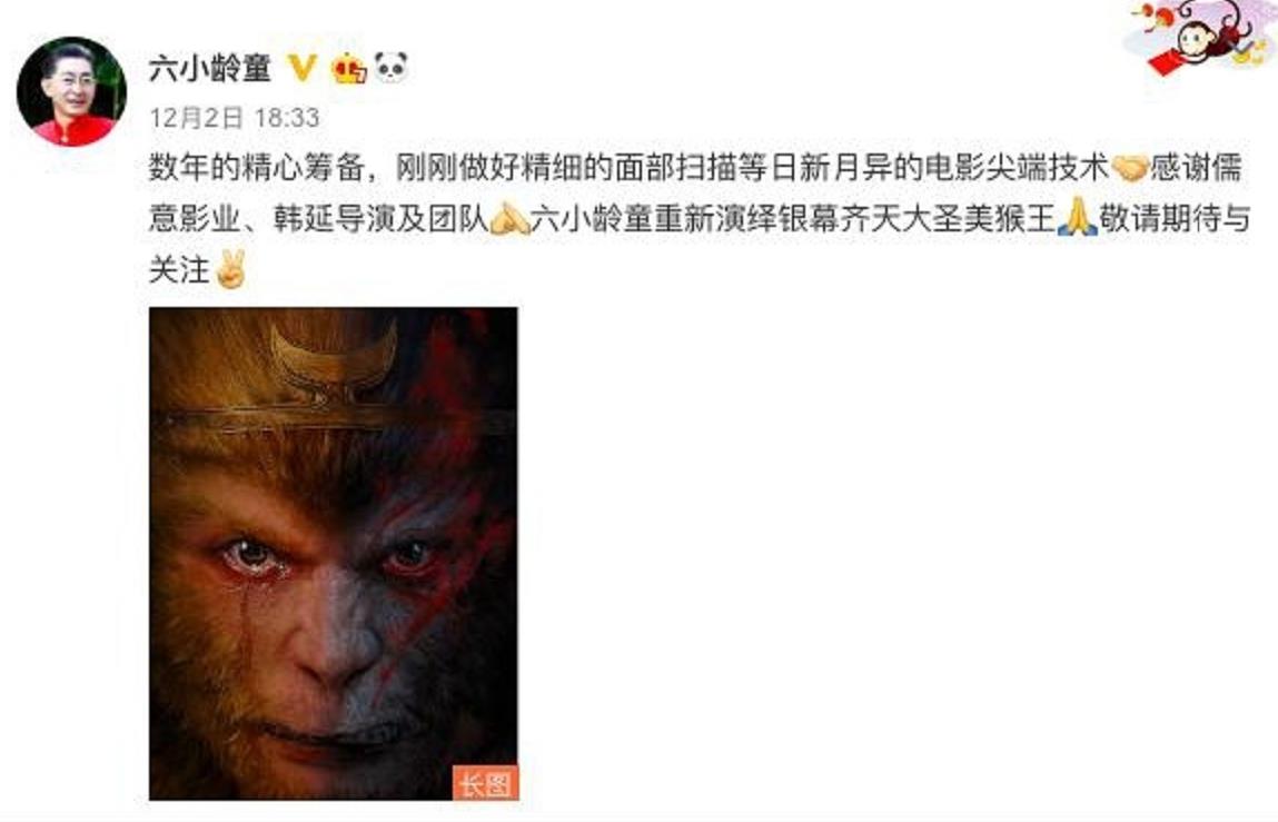 在文字中,六小龄童表示:自己刚刚完成了动作捕捉面部扫描。由此可见这部电影的特效难度和CG技术应该还是比较高的。