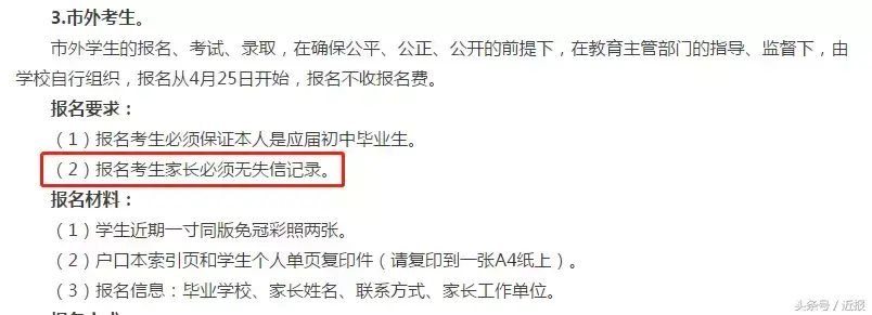 配图为该中学招生政策,其中一条是报名考生家长必须无失信记录。