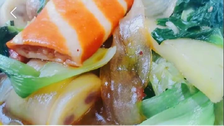 待锅中食材煮熟后,最后把油菜放入锅中,烫熟,放入一点盐,一点生抽即可出锅食用