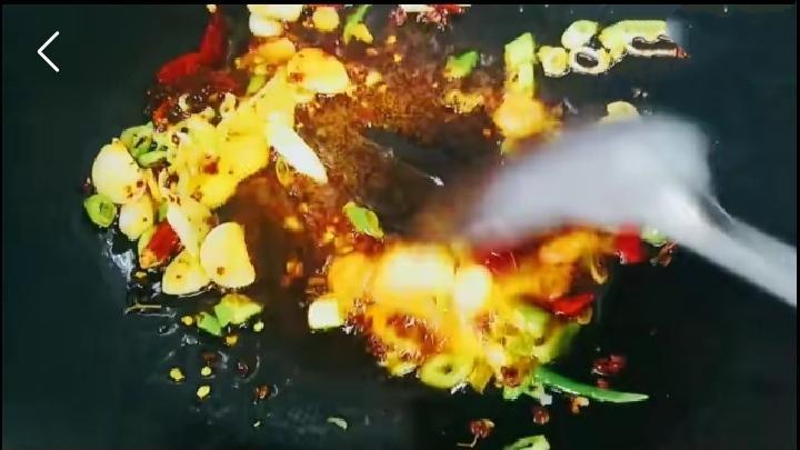 我们在锅中烧油,把葱姜蒜辣椒,花椒和火锅料依次放入锅中进行翻炒,将所有调料炒香后倒入水。