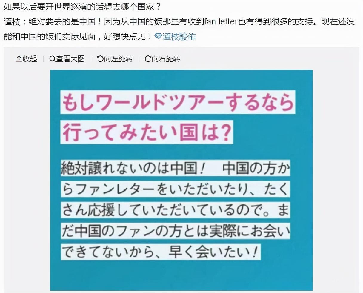 然而找遍全网,也没能看到这个片段,唯独能找到与我国有关的消息,是道枝骏佑曾被问到最想去哪个国家时,他羞涩的表示:自己经常收到中国粉丝的告白信,所以非常想来中国看看。