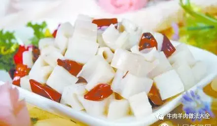 藕切丁,用水洗一下待用,油少量,八成热下丁,中火翻炒约一分钟,掰入干辣椒两个,盐少量,糖加不加都可以,少放一点。味精两粒。出锅。