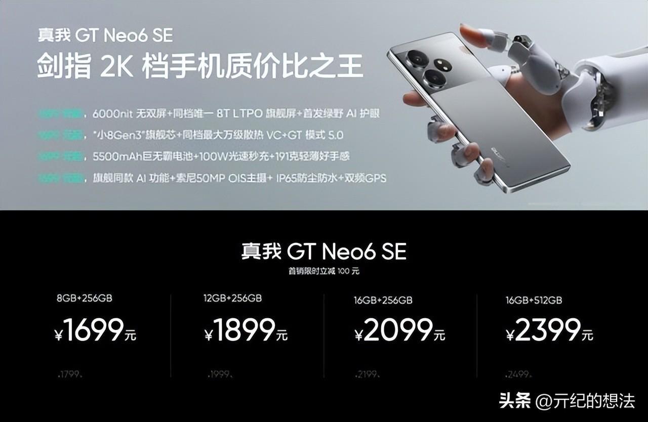 排名第二的是真我GT Neo6 SE(8GB+256GB),它的性价比值是758.6,安兔兔给出的售价是1799元。真我GT Neo6 SE搭载第三代骁龙7+,能够在性价比中遥遥领先的原因是提供了8GB+256GB版本,所以价格方面比其他三款机型更有优势。该机的核心优势是1.5K无双微曲屏,拥有6000尼特峰值亮度和LTPO自适应刷新率,支持双频GPS和IP65防水,槽点是全塑料机身,续航也是5500毫安时电池和100W闪充。在预算允许的情况下,不推荐8GB运存版本,如果12GB+256GB版回归1899元的话那就更香的。